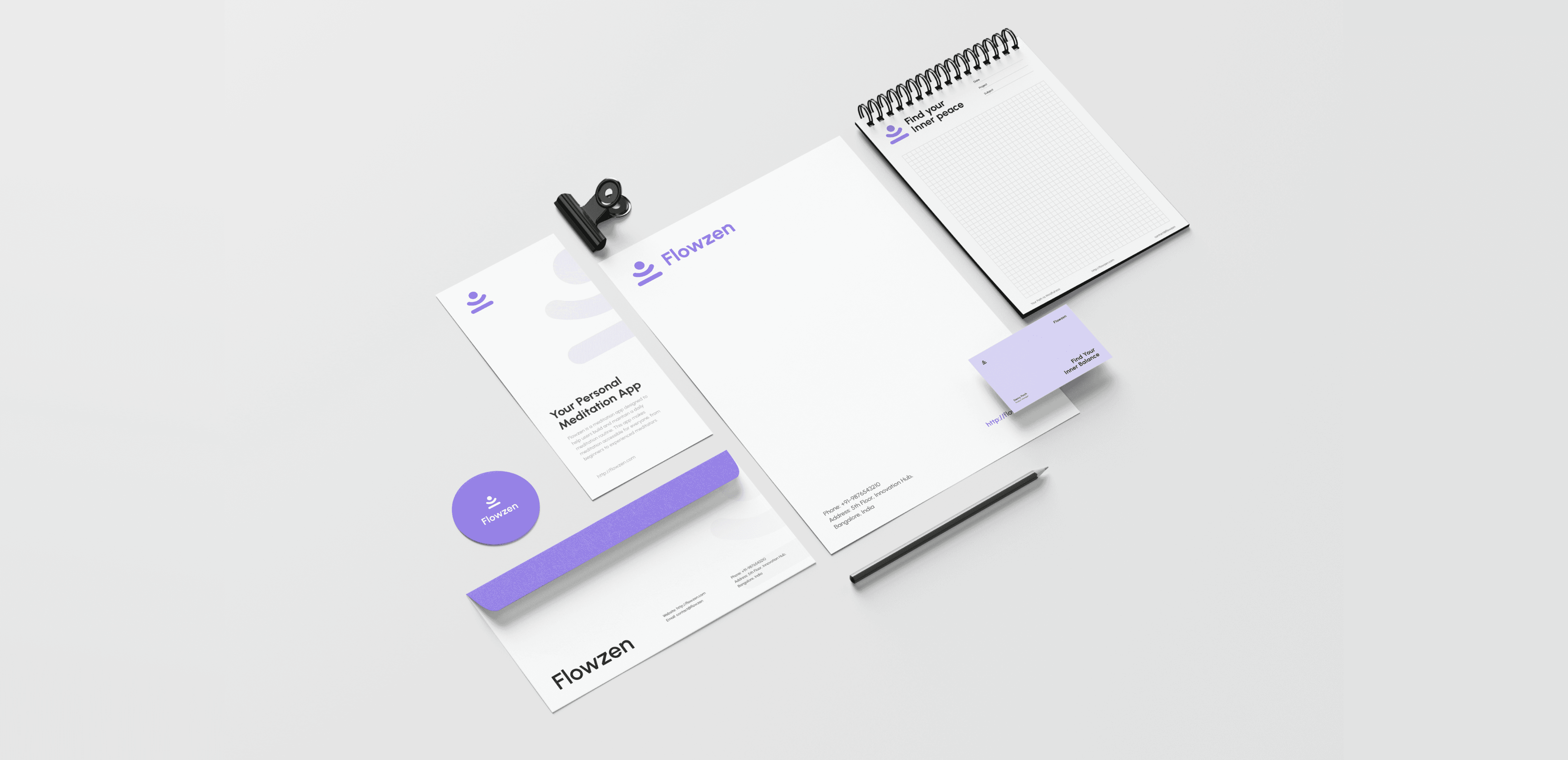 The Flowzen logo merges simplicity with intention. Using a custom geometric sans-serif approach, we built a wordmark that is modern, approachable, and professional. Rounded terminals in the letterforms suggest calm and friendliness, while the symmetry reflects balance and structure. The color palette includes calming blues and subtle greys, evoking trust and focus. We extended the identity into iconography, motion, and brand patterns for a complete toolkit.