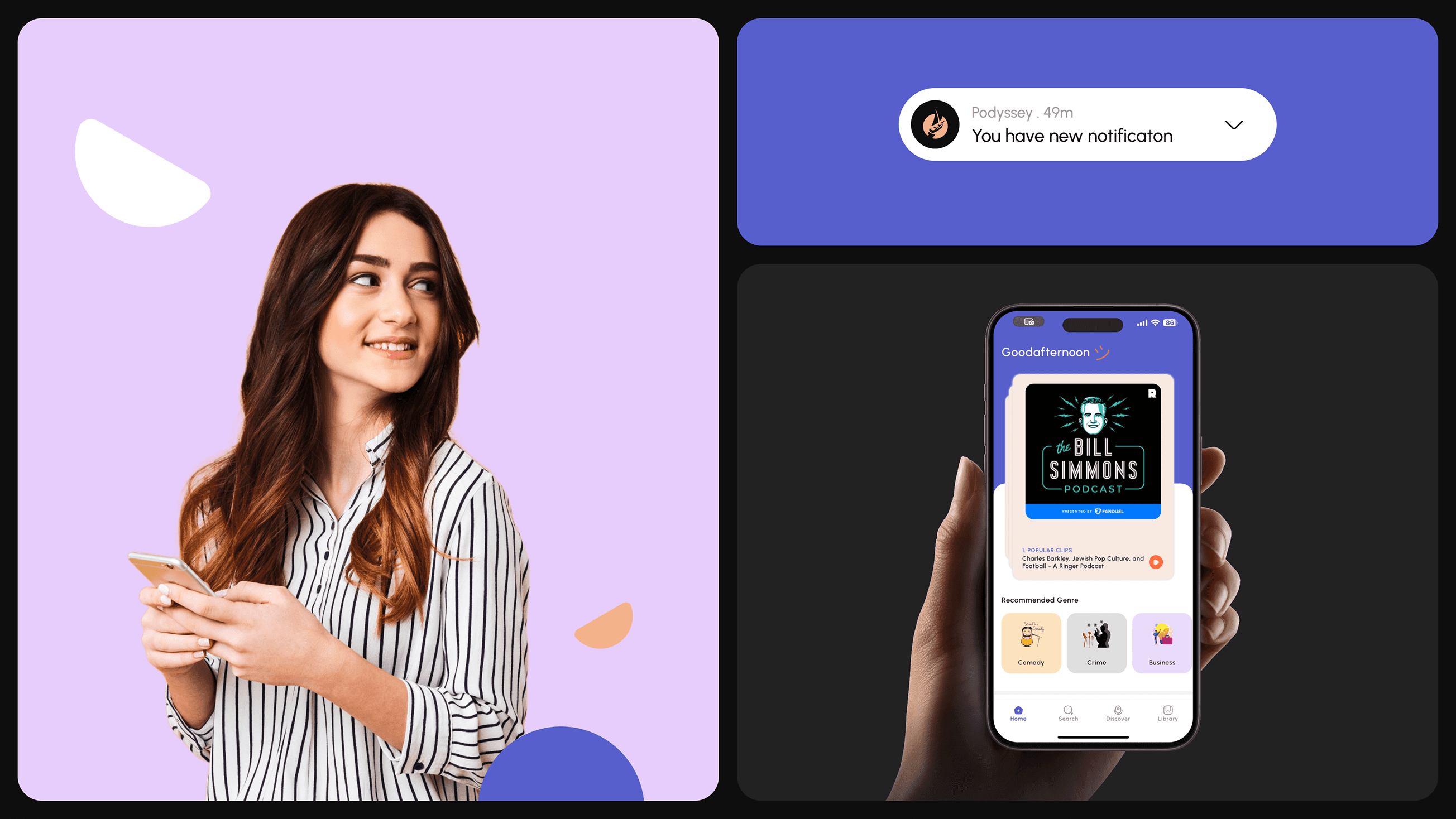 Podyssey’s app interface is designed to offer a seamless and immersive listening experience. The layout focuses on clarity and usability, with a minimalist aesthetic that lets content take center stage. From intuitive onboarding to personalized recommendations, every interaction is crafted to feel natural and engaging. We prioritized accessibility and ease, ensuring users can browse, subscribe, and listen without friction. Custom podcast pages, smooth playback controls, and a clean navigation system make Podyssey a joy to use — whether you’re discovering new creators or staying tuned to your favorites.