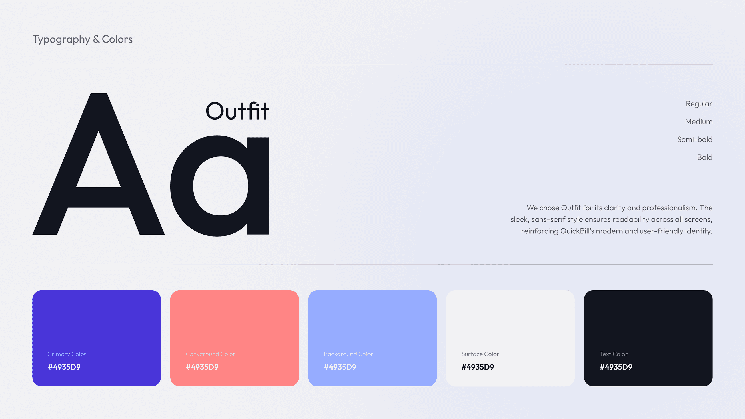 We began with understanding the user — from independent creators and shop owners to service-based professionals. These users needed something functional yet beautiful. They valued accuracy, quick turnaround, and professionalism in billing. We also looked at competitors and found many were either too complex or too outdated. QuickBill needed to position itself as a smart, fast, and easy alternative designed for modern use but built with trust and clarity at its core.